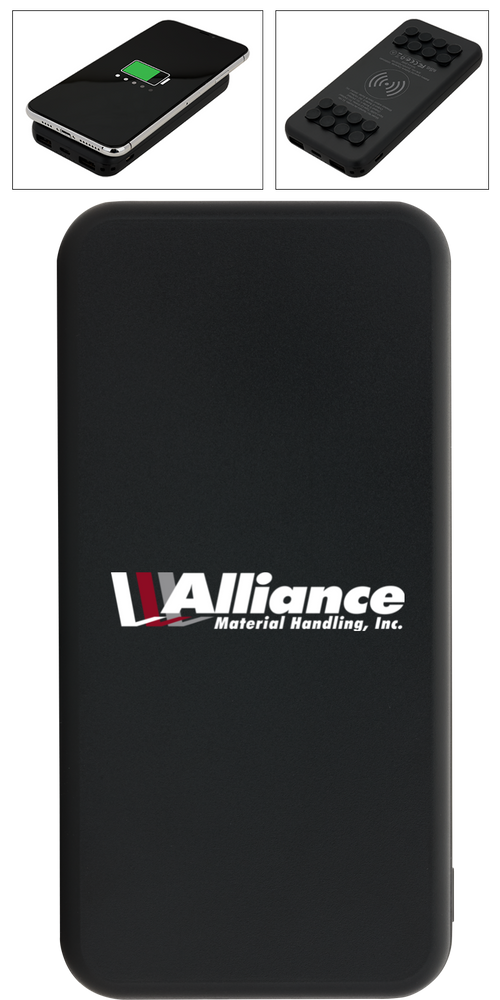 • 16 built-in suction cups on wireless charging surface hold your device • ABS black plastic shell • Power bank capacity: 10,000 mAh • Dual USB ports allow two devices to charge simultaneously • USB 1 Output: 5V/1A • USB 2 Output: 5V/2A • Micro USB Input: 5V/2A • Type-C Input: 5V/2A • Wireless Output: 5V/1A • Approx power bank recharge time: 2-5 hours • Indicator lights – Blue for battery levels; Red for wireless charging • Connect a USB cable to the device port for optional wired charging • Charges through most protective cases • Wall charger not included • Includes Micro USB charging cable • NOTE: If your device is not compatible with wireless charging you may require external wireless charging receiver or receiver case